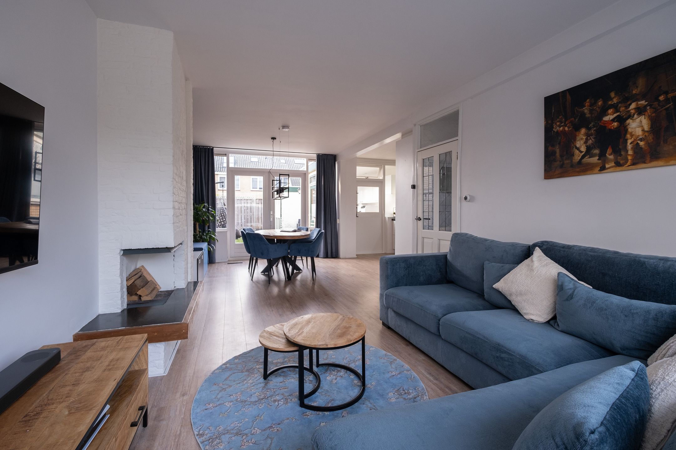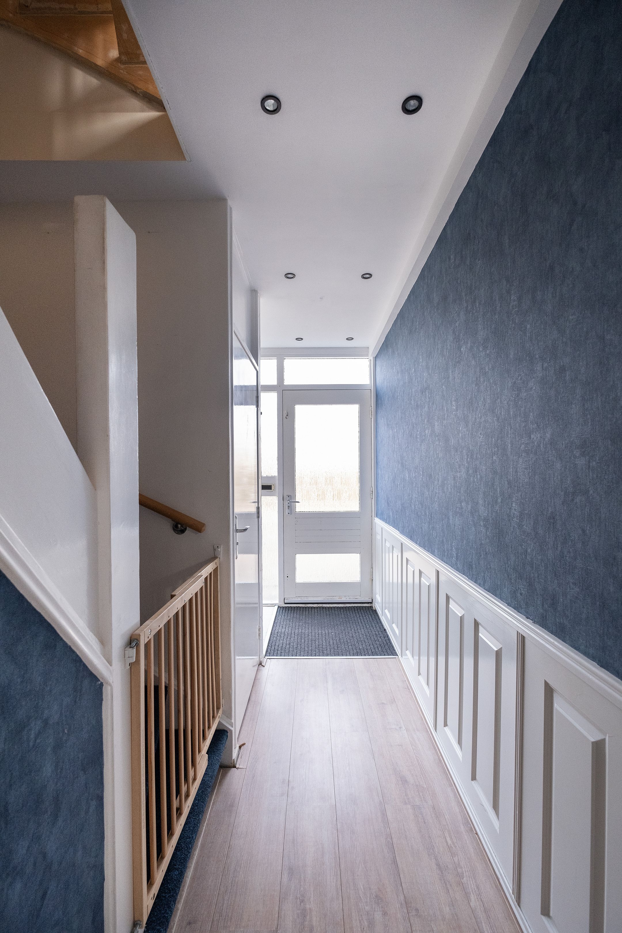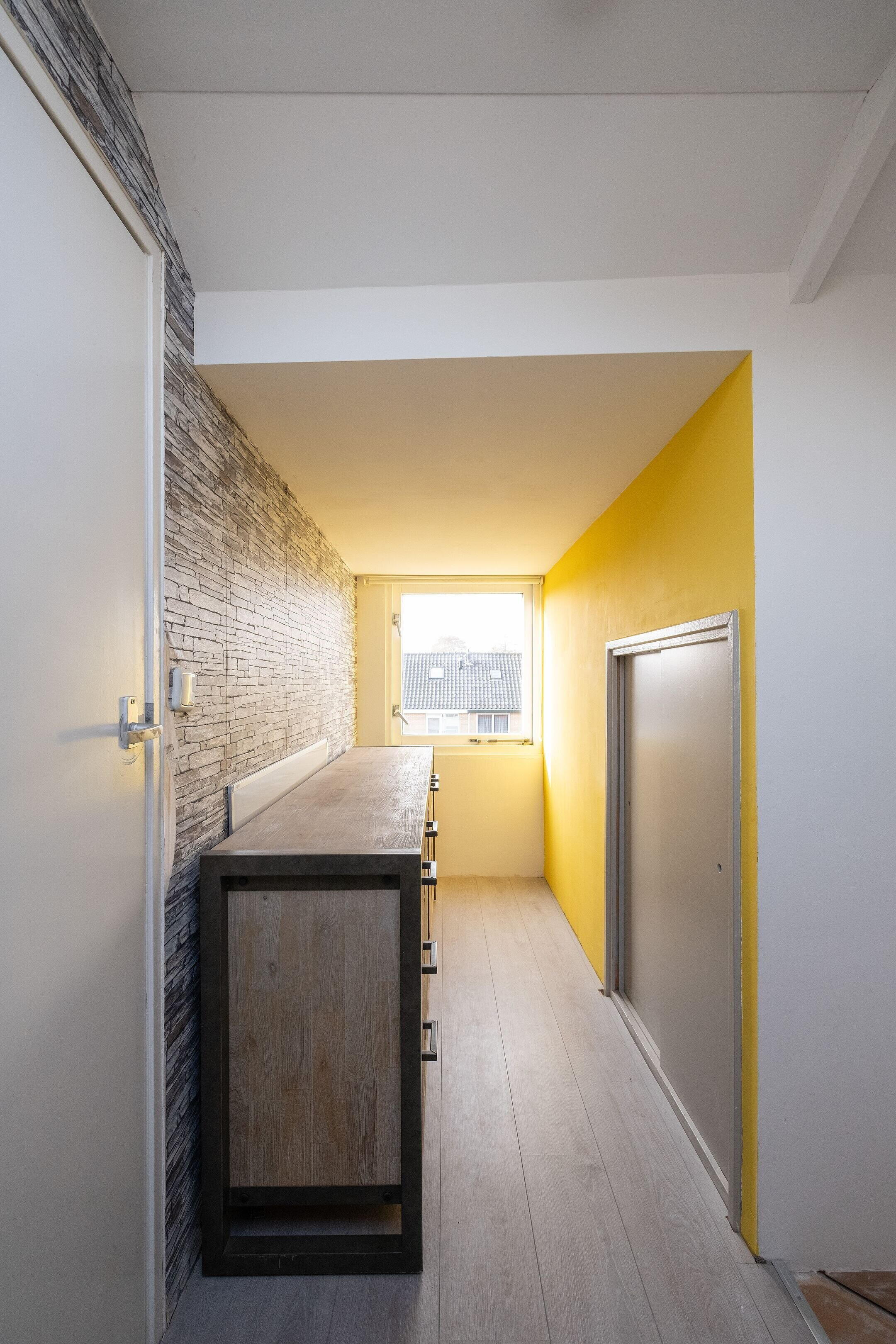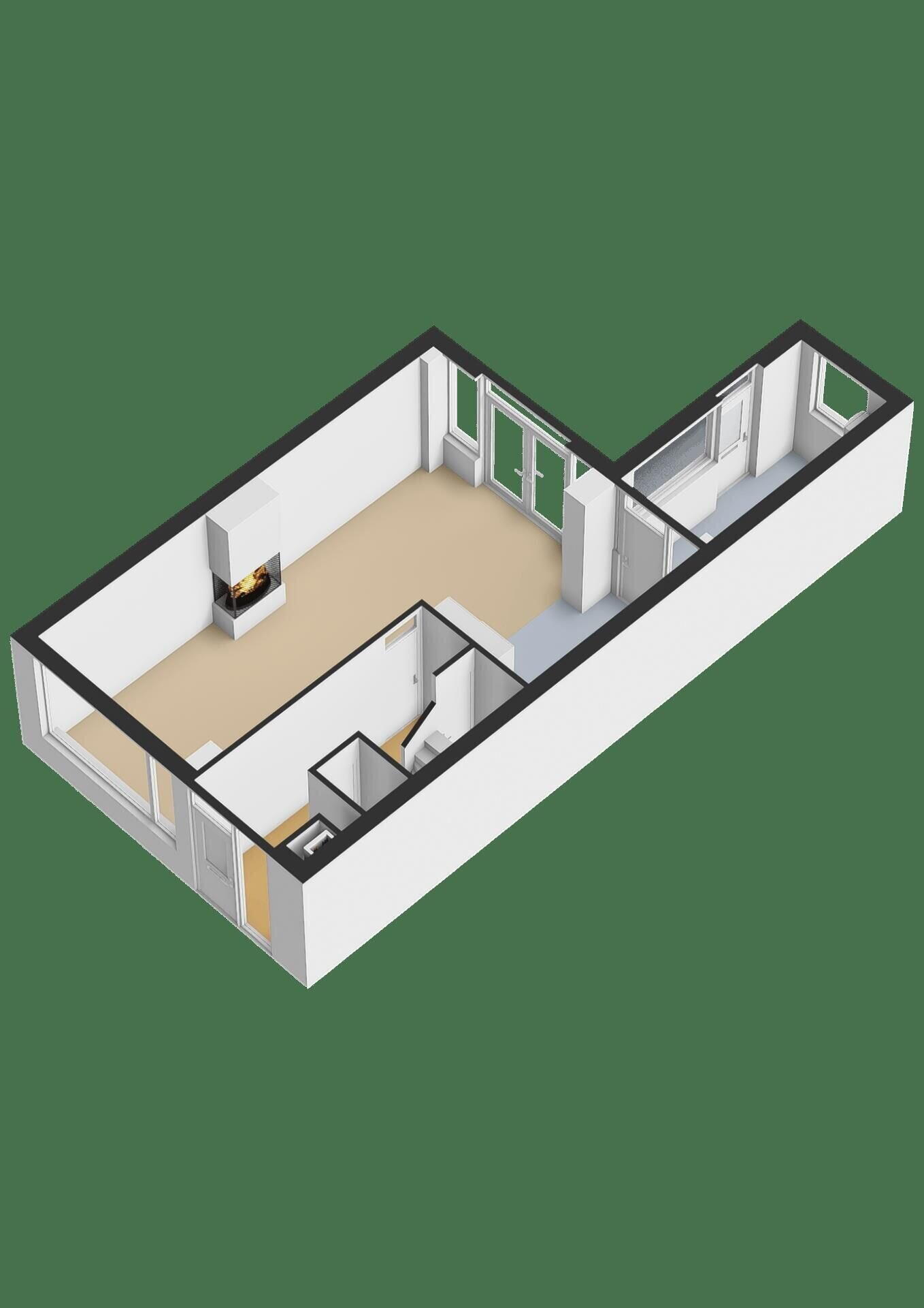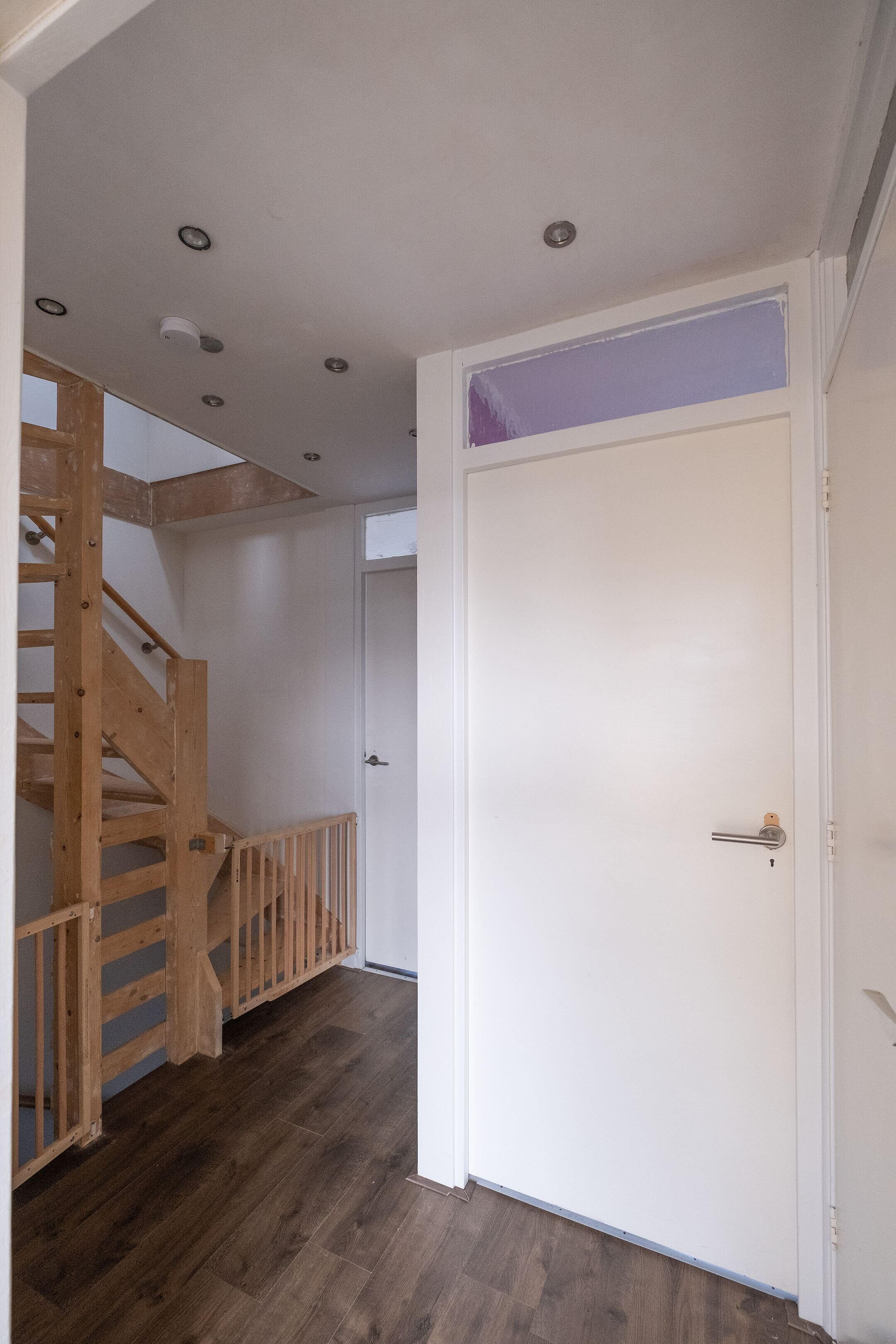 Via de entree kom je binnen in de hal met meterkast. De woonkamer is ruim en licht dankzij het grote raam aan de voorzijde en de openslaande deuren aan de achterzijde. Het hoge plafond versterkt het ruimtelijke gevoel. De vloer is afgewerkt met laminaat en de open haard zorgt voor extra sfeer.