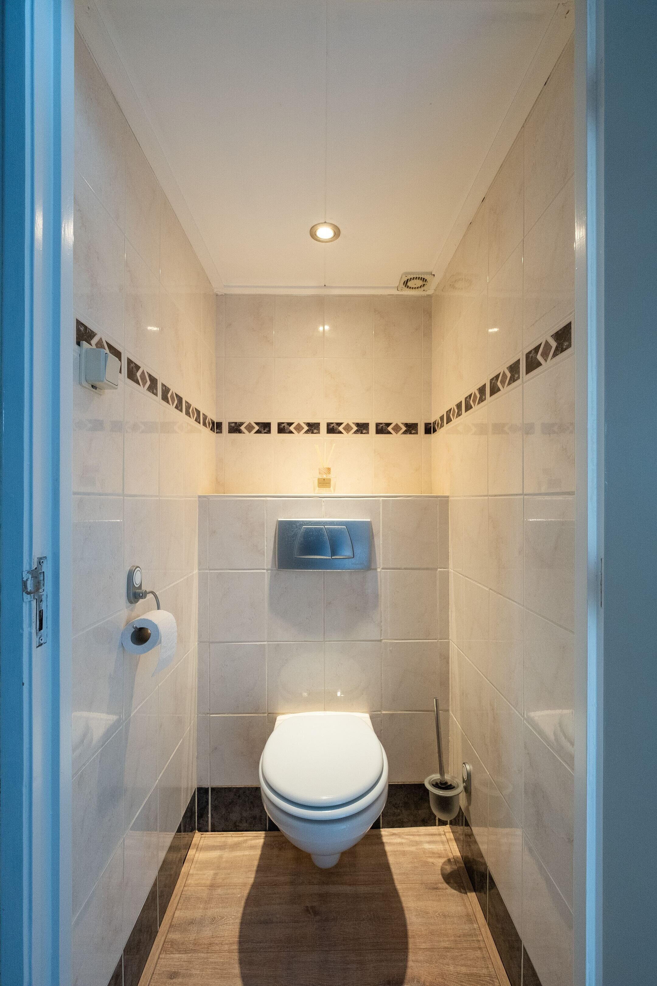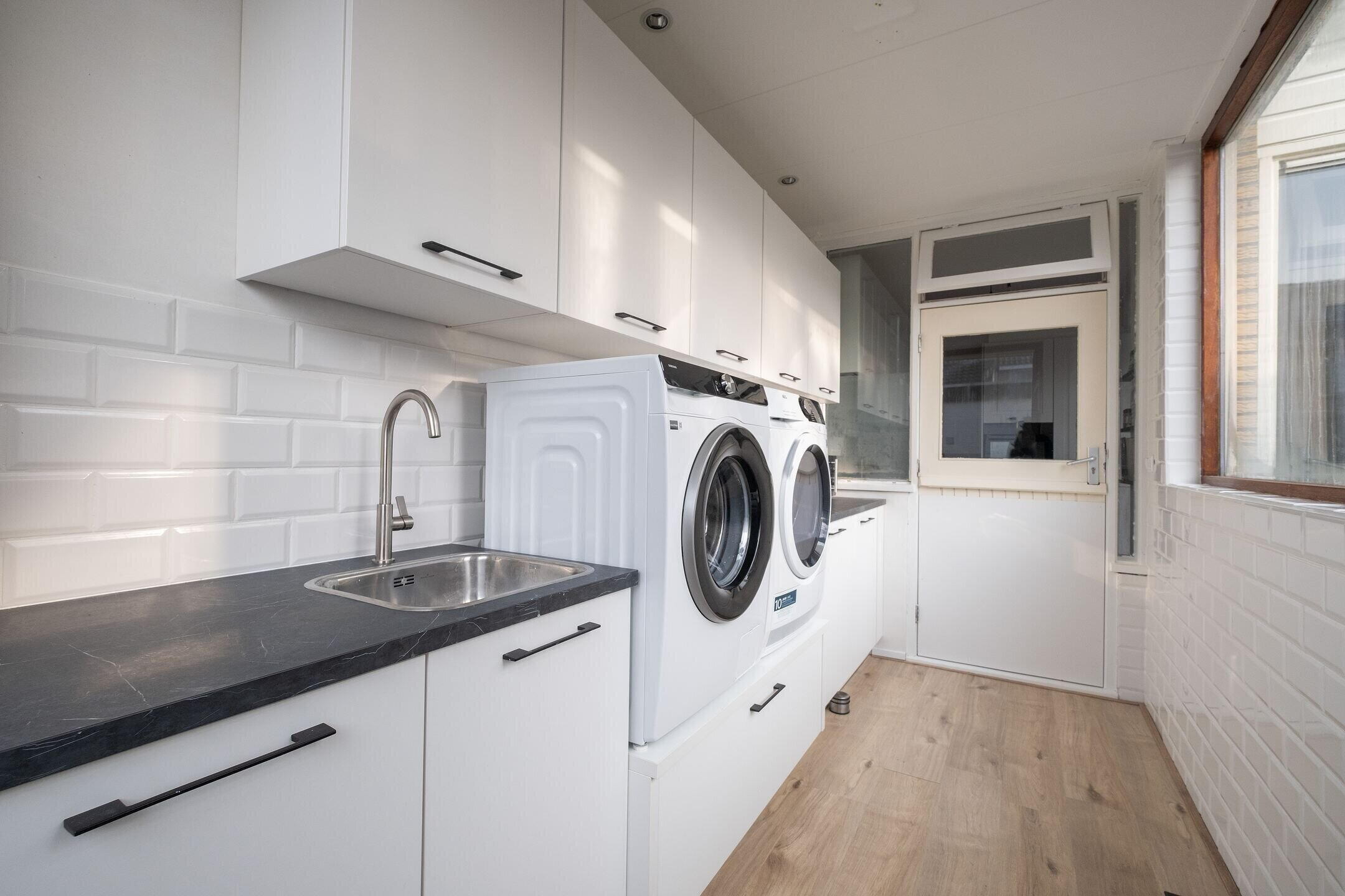 Aangrenzend vind je de bijkeuken met de CV installatie voor warm water en ruimte voor de wasmachine en of droger en een wastafel.