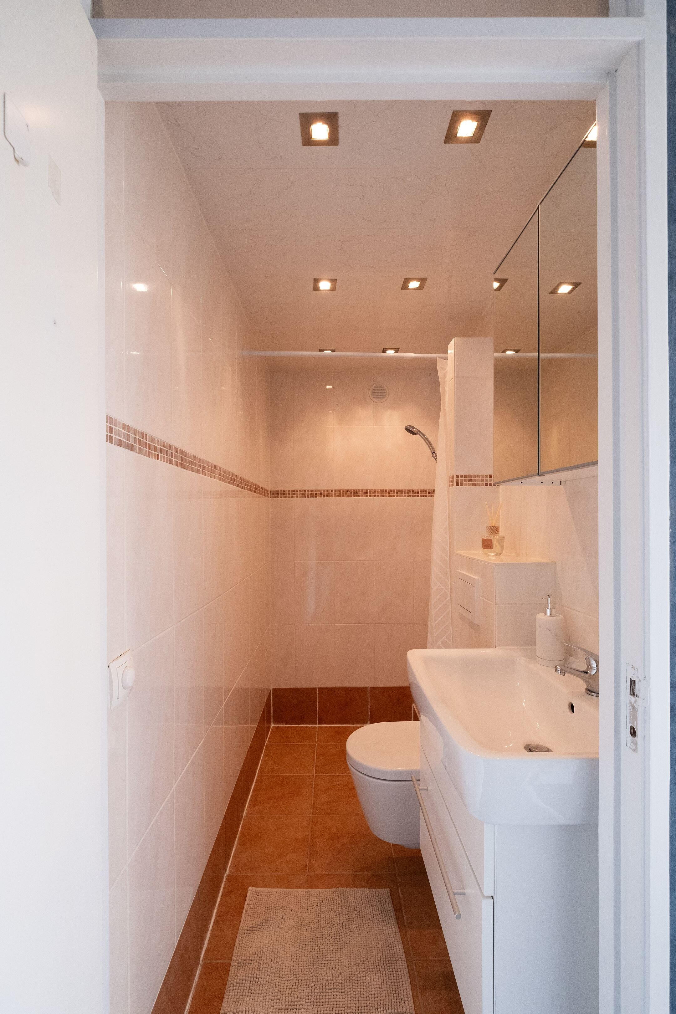 De badkamer is compleet ingericht met een wastafelmeubel, toilet, inloopdouche en spotverlichting.